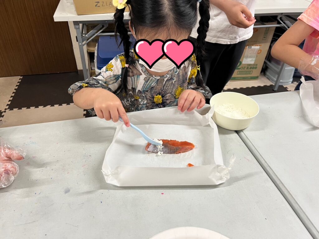 「おさかな。。。😨さわれない。。。😨😨」と固まる小さなお友だちはスプーン🥄を使って参加😊
