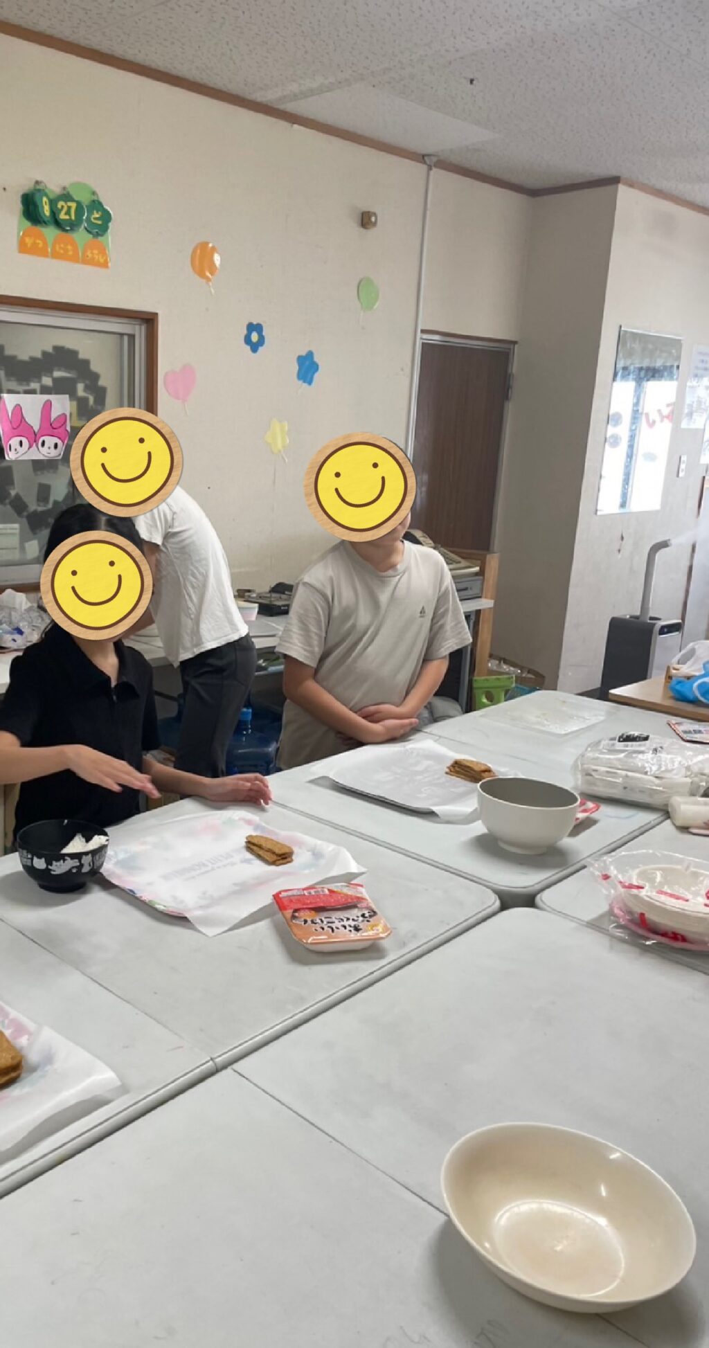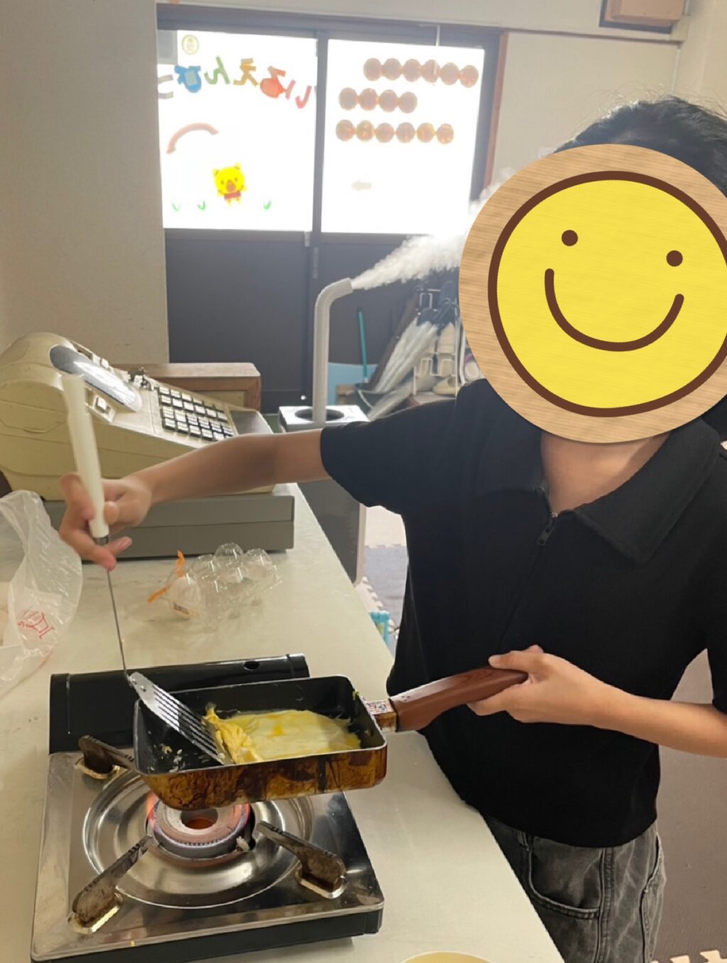 みんな大好きだし巻き玉子はふわっと上手に焼き上がると「めっちゃいいにおいする!」「切ったら黄色がきれい〜」と盛り上がり、食べる前からみんな笑顔いっぱい😊