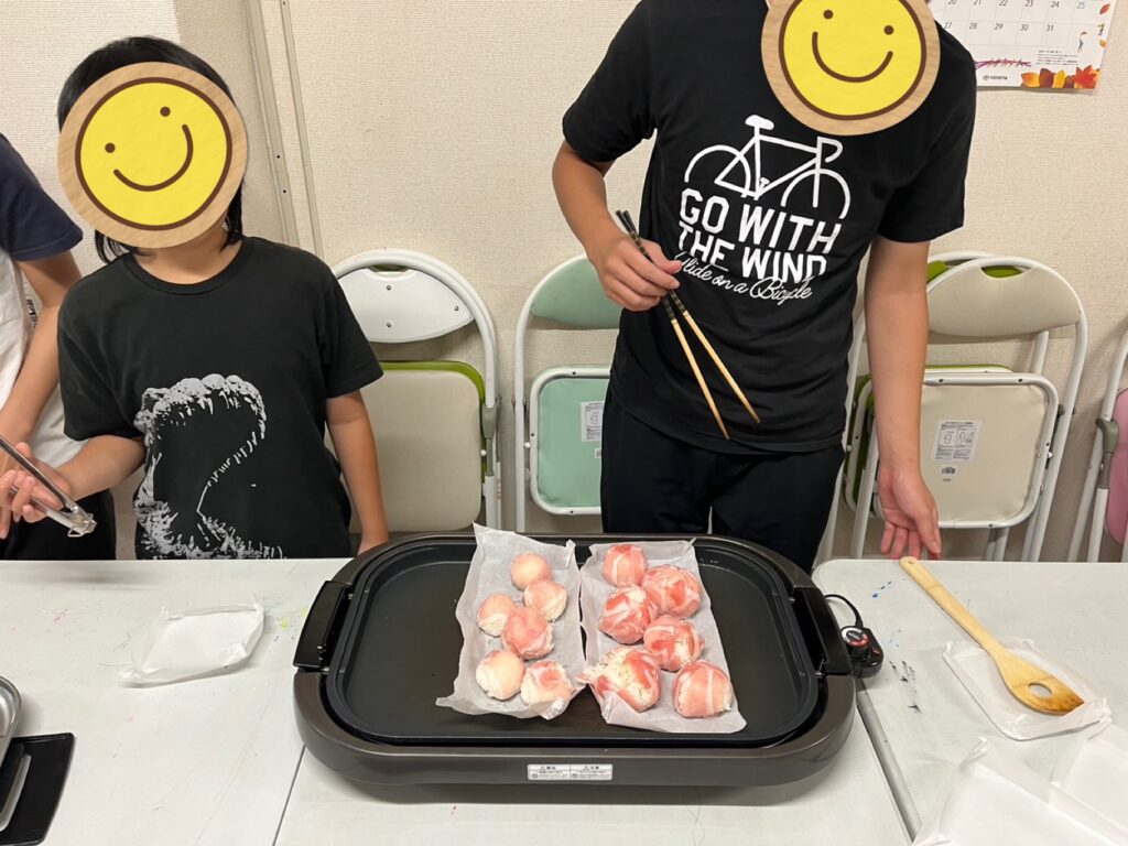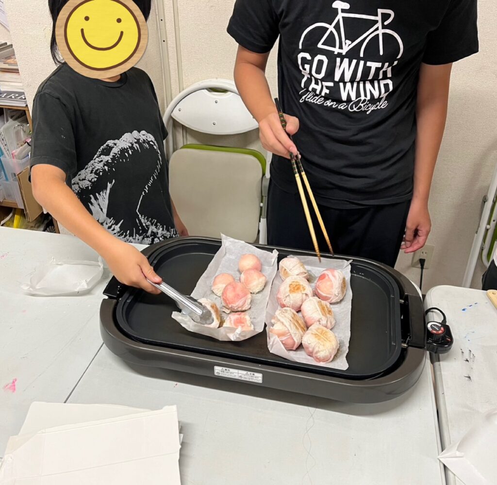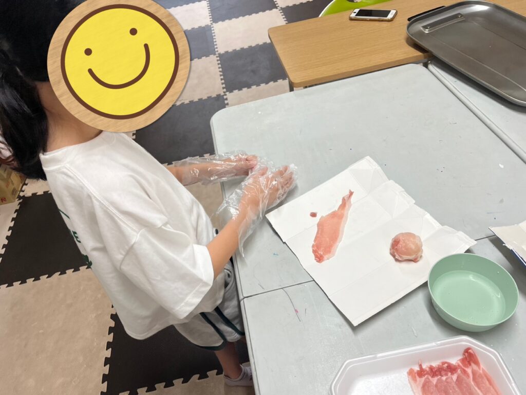 「このくらいの大きさでいいかな?」「うわ〜お肉きれいに巻けた!」と、お友だち同士で声をかけ合いながら楽しそうにクッキング🧑🍳👩🍳