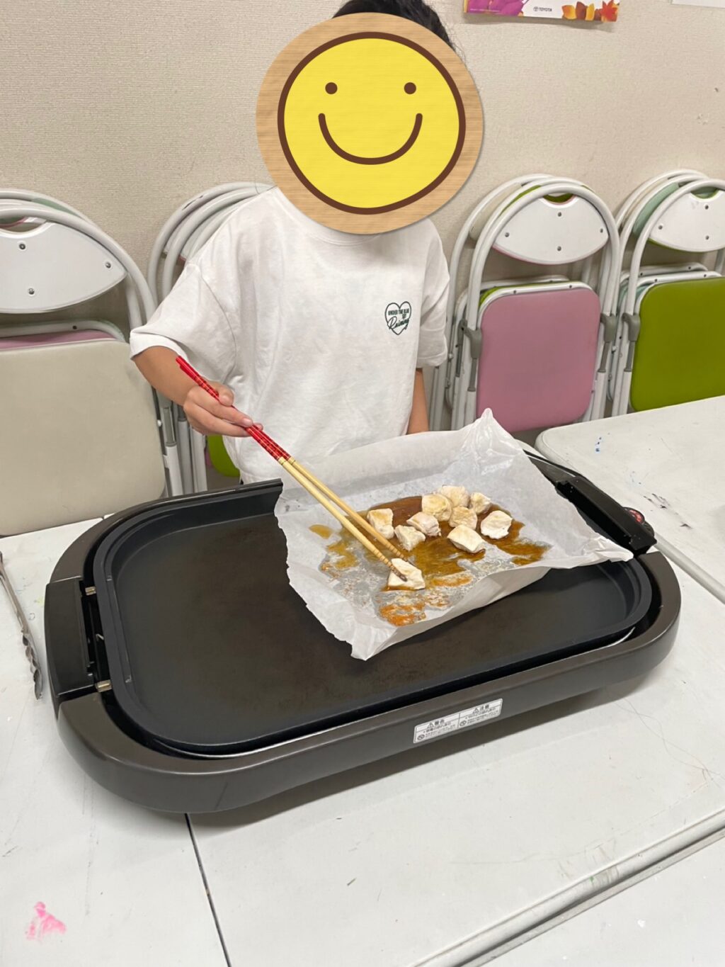 「見て見て!照りが出てきた〜😳」「たれがツヤツヤになってきたで‼️」と大興奮の子どもたち🍗スタッフと一緒にお肉をひっくり返したり、タレを絡めたりして、みんな真剣な表情で取り組んでいました😊