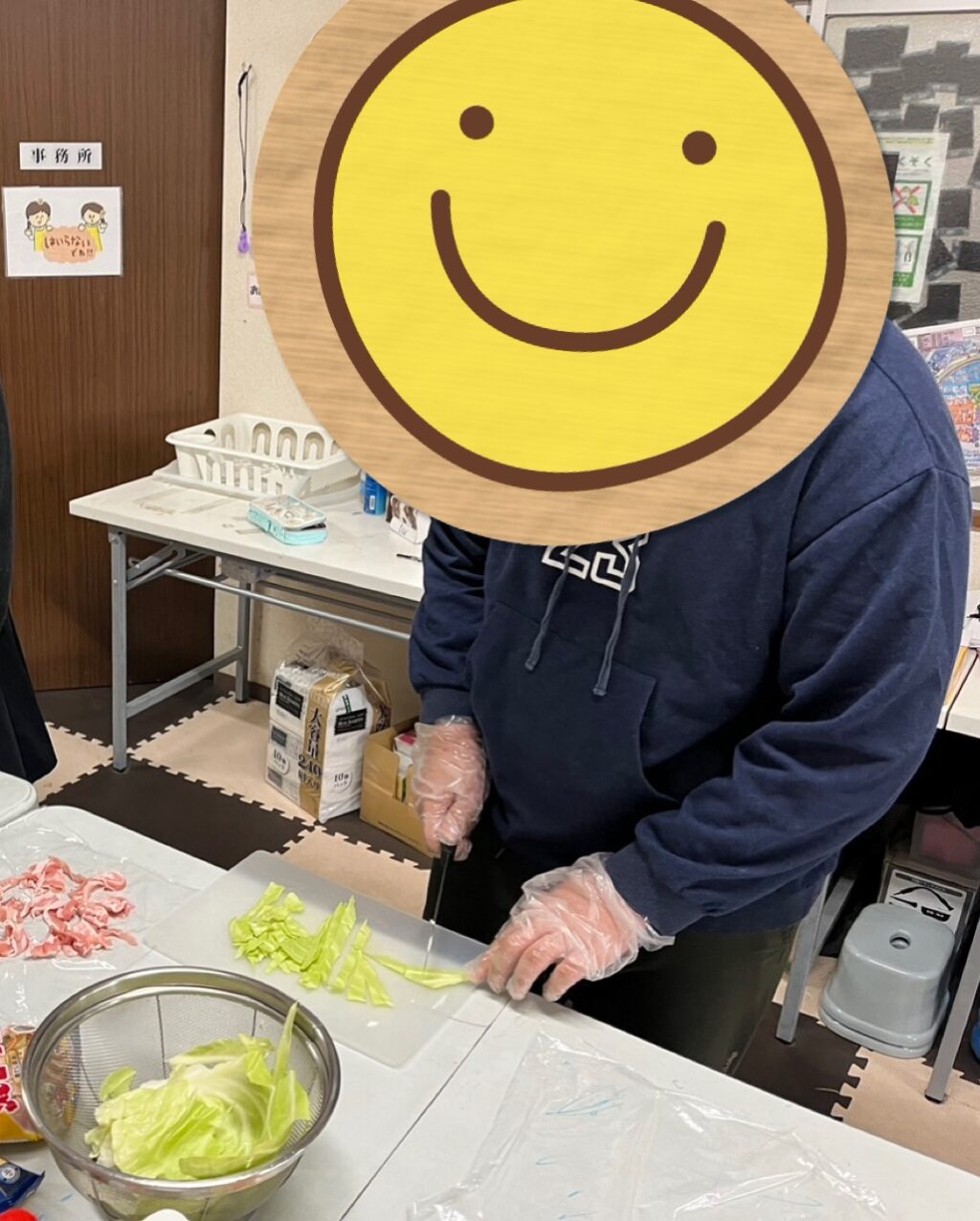 その間に、いつもクッキングに参加しているお友だち達は手洗い・消毒・マスク・手袋をして準備完了👍いよいよクッキングスタート❗️