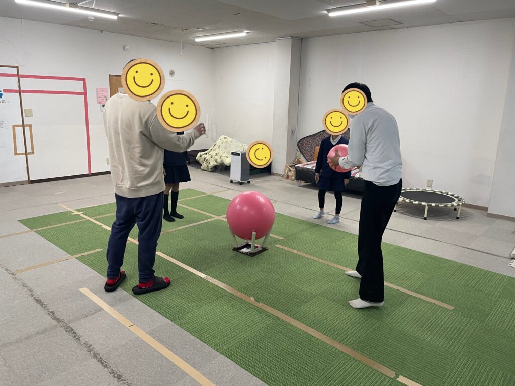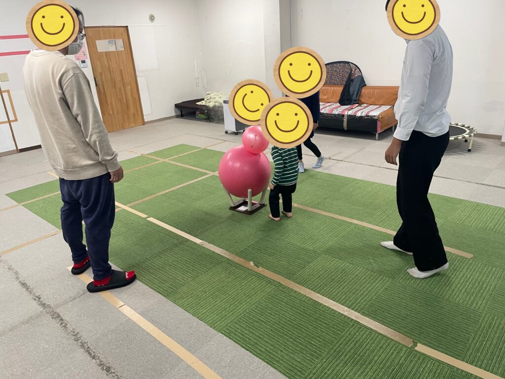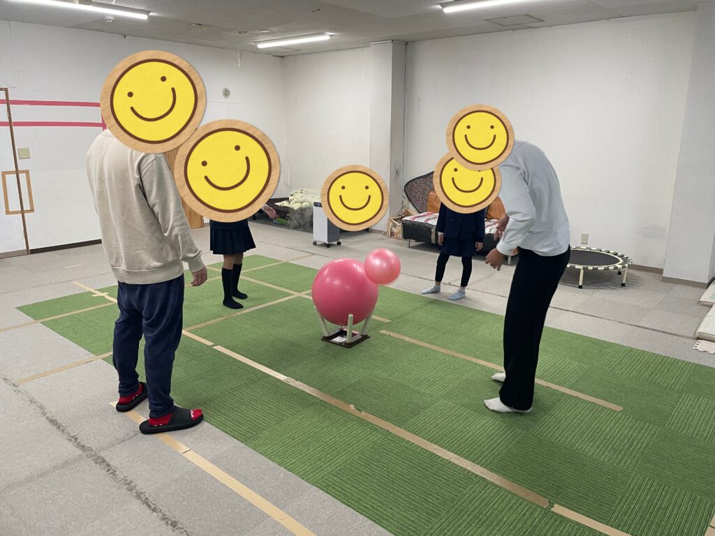 バランスボールにボールを当てて、跳ね返ったボールをキャッチする“ちょっと変わったキャッチボール”🎵