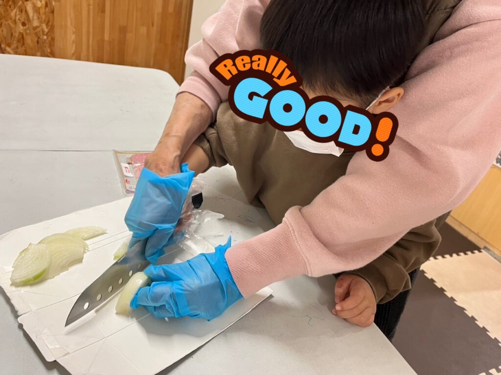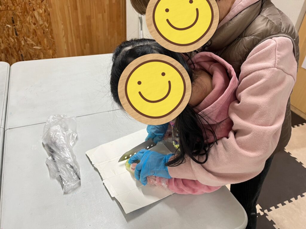 今回も小さなお友だちはスタッフと一緒にゆっくり丁寧に包丁を使って具材をカット🔪