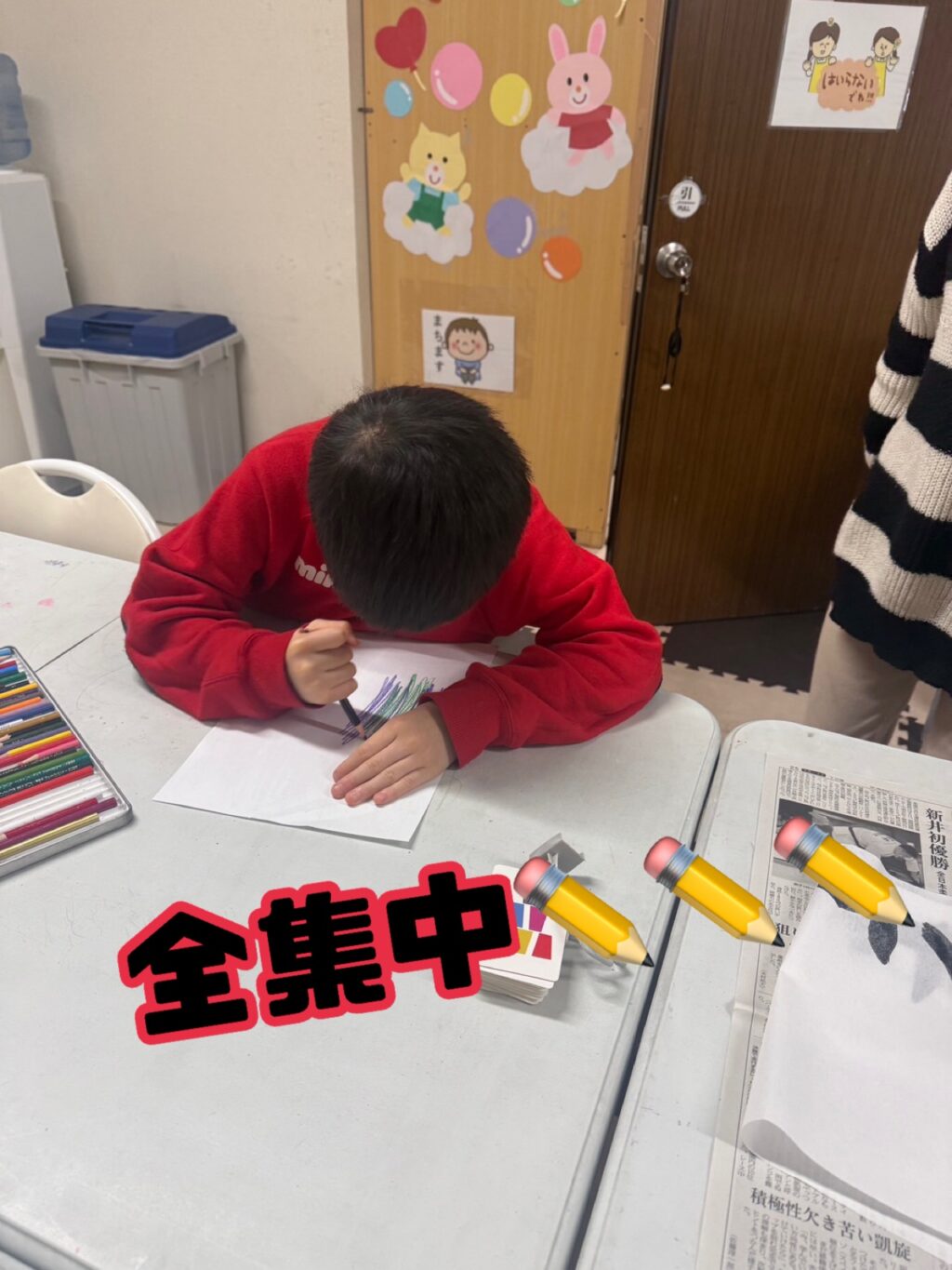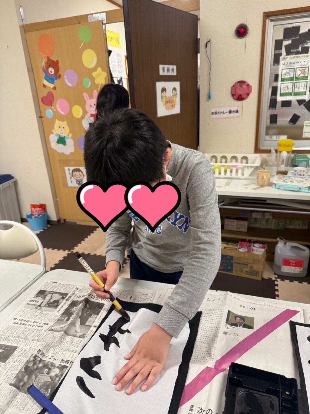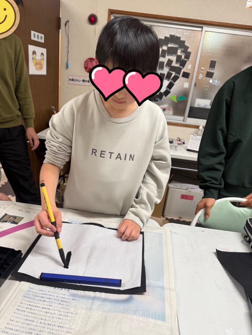 と少し戸惑っていたお友だちも、師範スタッフの「好きな言葉を書いたらいいよ。それが書き初めやから😃」という優しい声かけに、ホッと安心した表情に😊