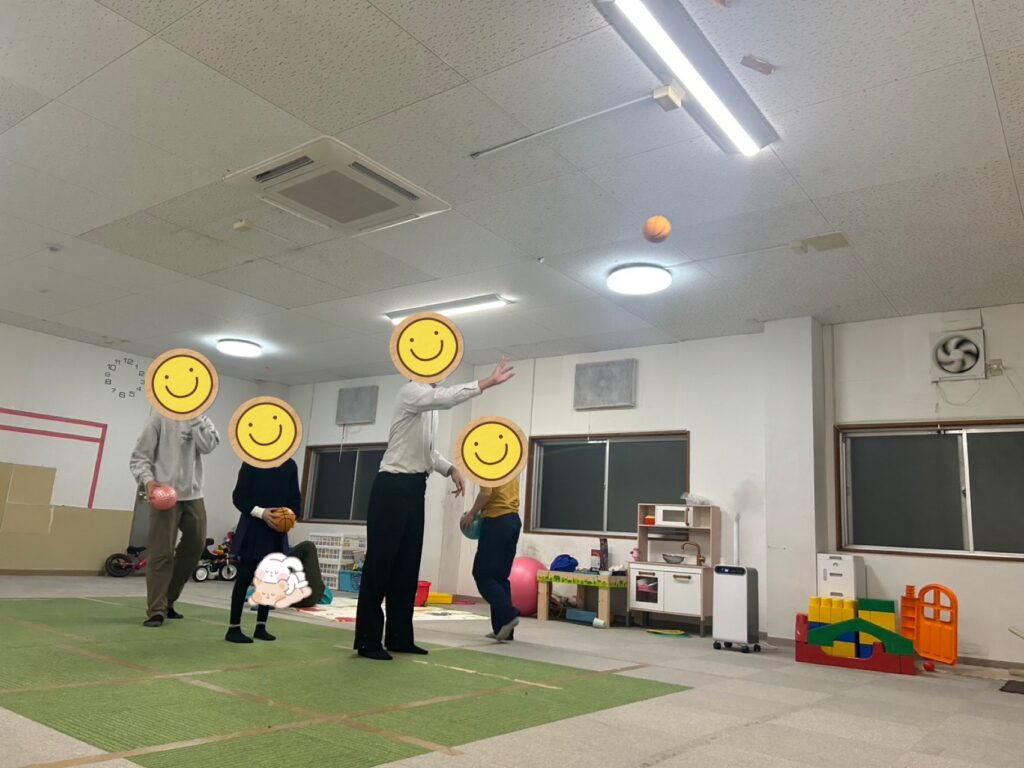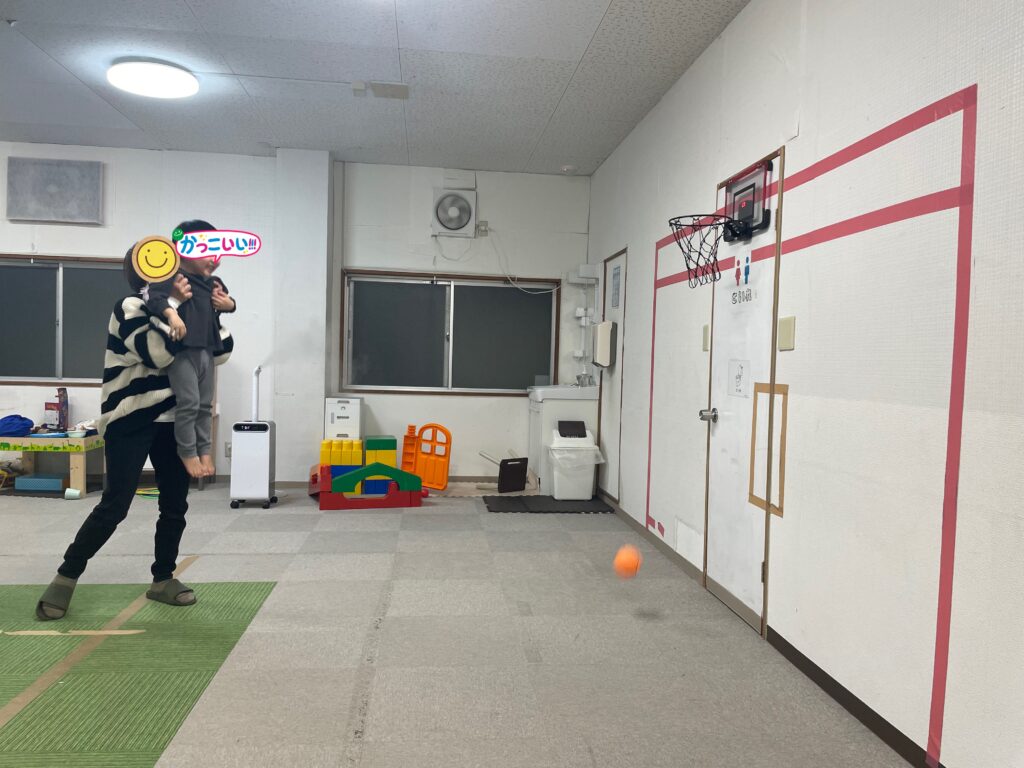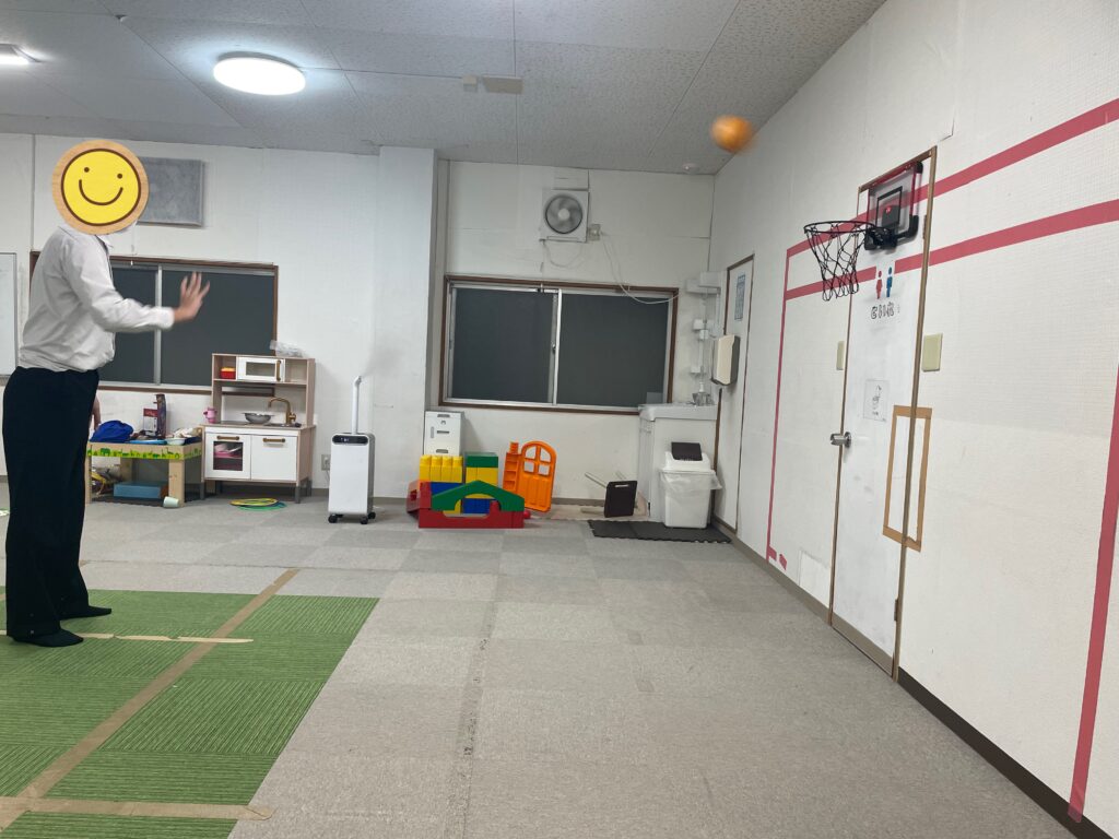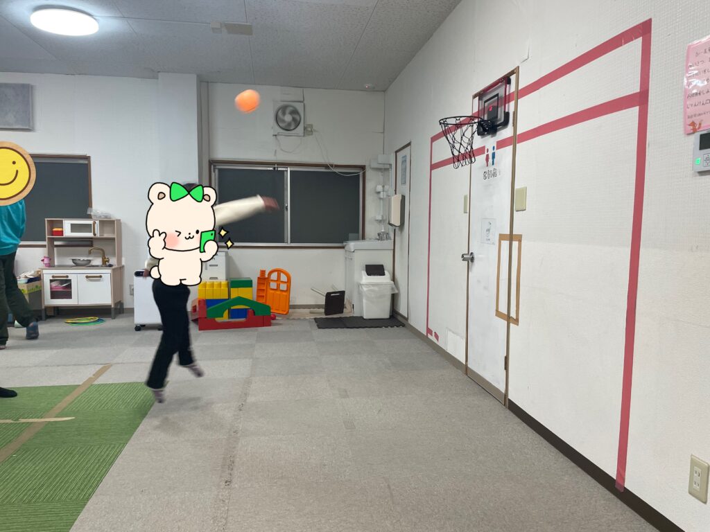 「これは近いから余裕やわ👍」と言うのはバスケットゴールをサンタさんにお願いしていたお姉さん👩「それでは順番に並んでスタート❗️」とスタッフのかけ声で順番にゴールに向かってシュートするお友だち達🏀お友だちと一緒に「私もやりたいから並ぶ〜😃」とスタッフも一緒に並んでシュート🏀1番最初にシュートを決めたのお姉さん👏すると「次はその後の線からシュートするわ😃」と難しいシュートに挑戦していました🏀シュートをするお友だちの後ろで並ぶお友だち達は「〇〇くんめっちゃ惜しい💦」や「〇〇くんあと少しやのに〜」「ナイス👍今の入ると思ったのに〜😆」と自然と前向きになる言葉がお友だち同士で溢れる訓練室に☺️👍一緒に参加していたスタッフも応援に思わず力が入っていました😤段々とコツを掴んだお友だち達は順番を守りながら、さらにリズミカルにシュートしては入れ替わり、まるでバスケ部のシュート練習をしているような光景に🤣お友だち達も