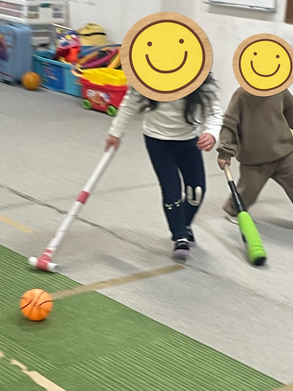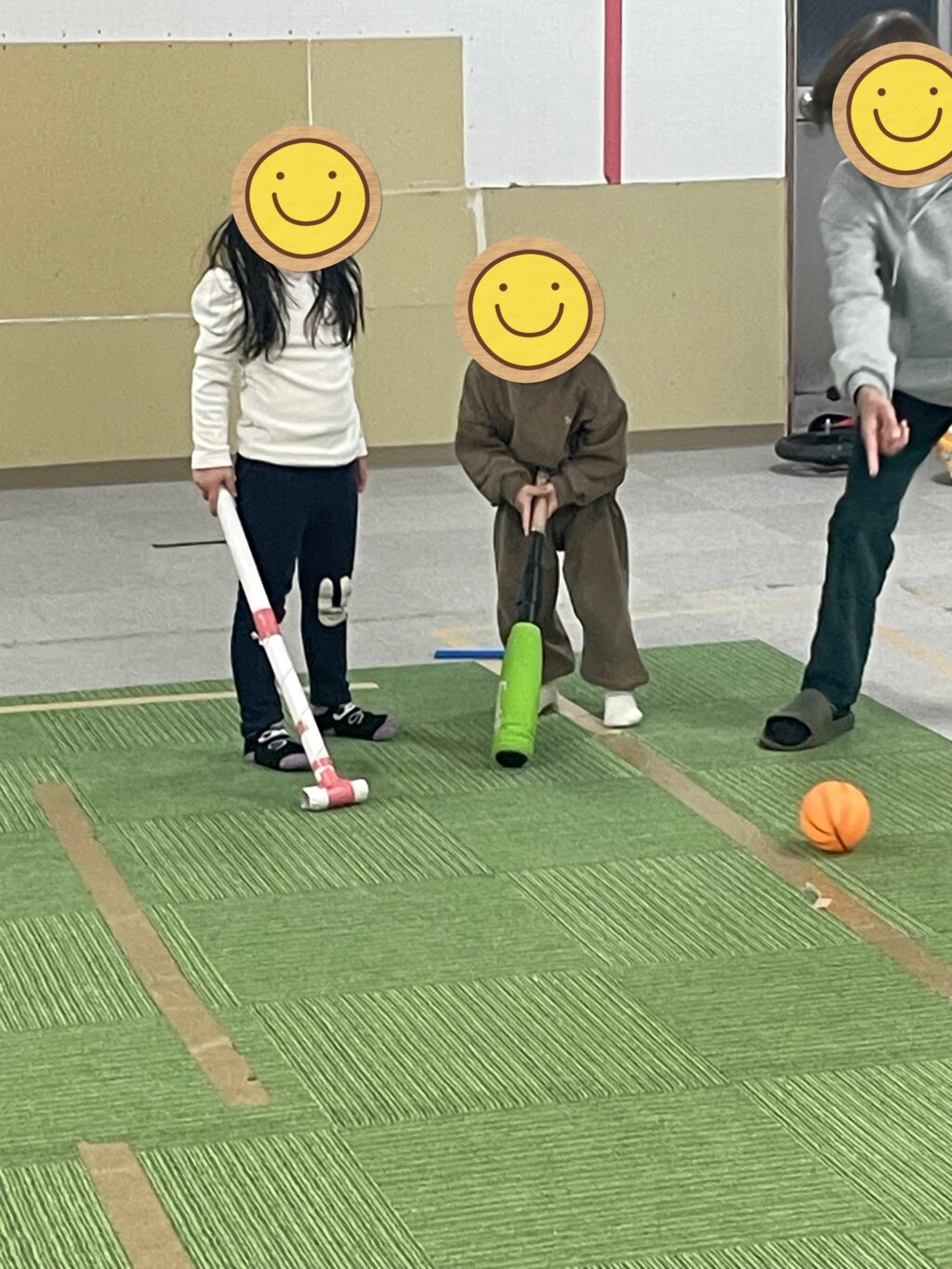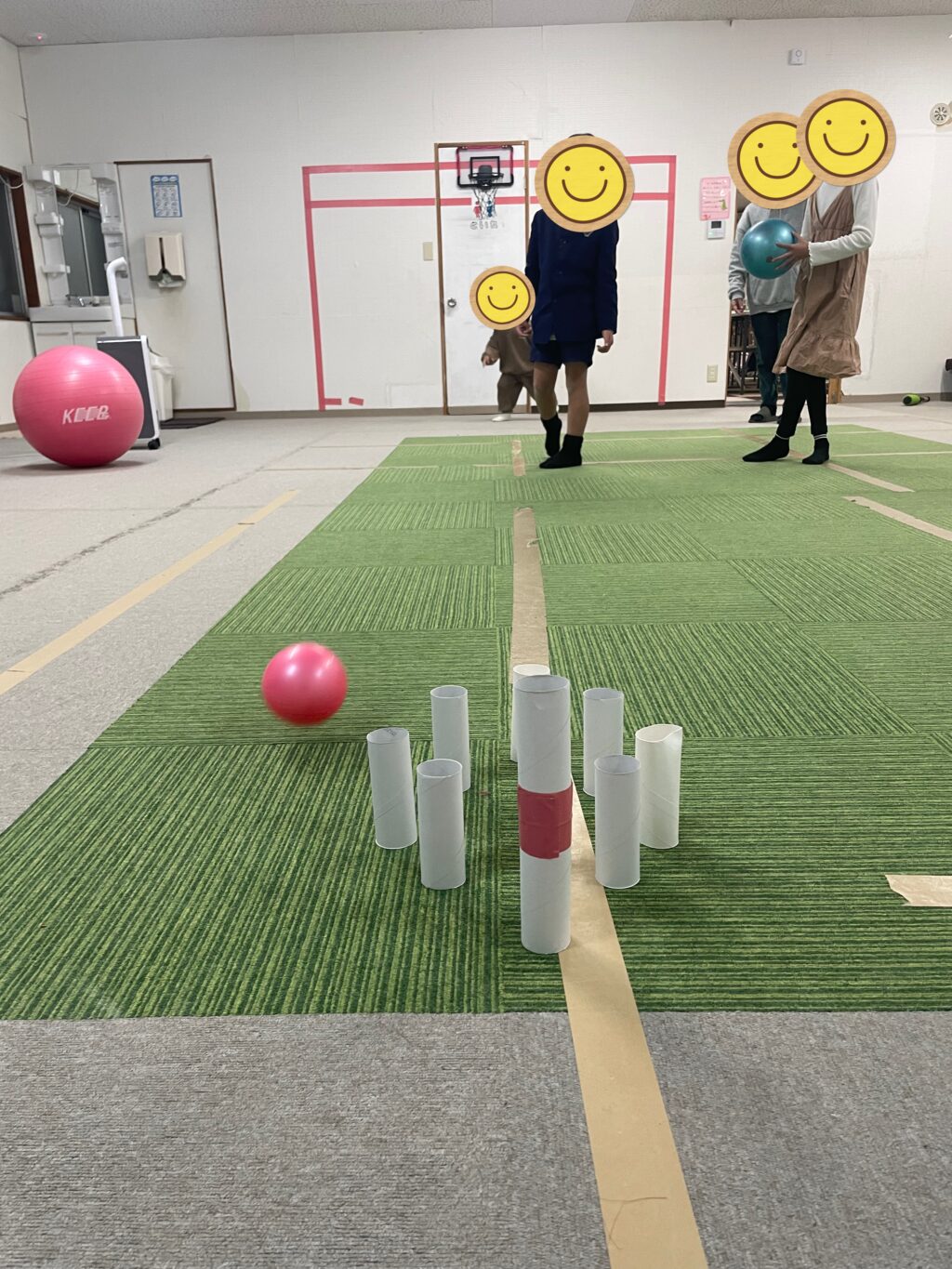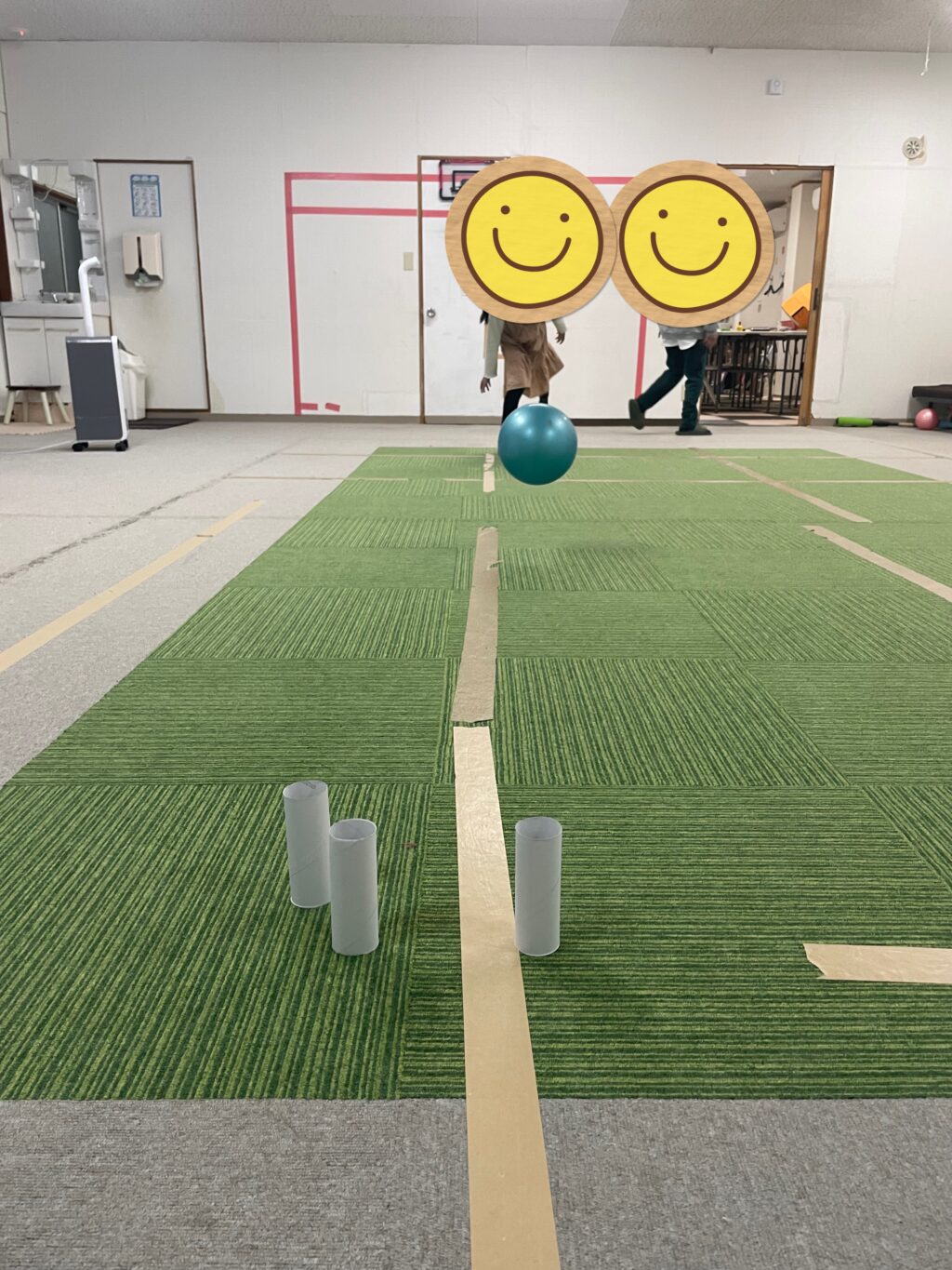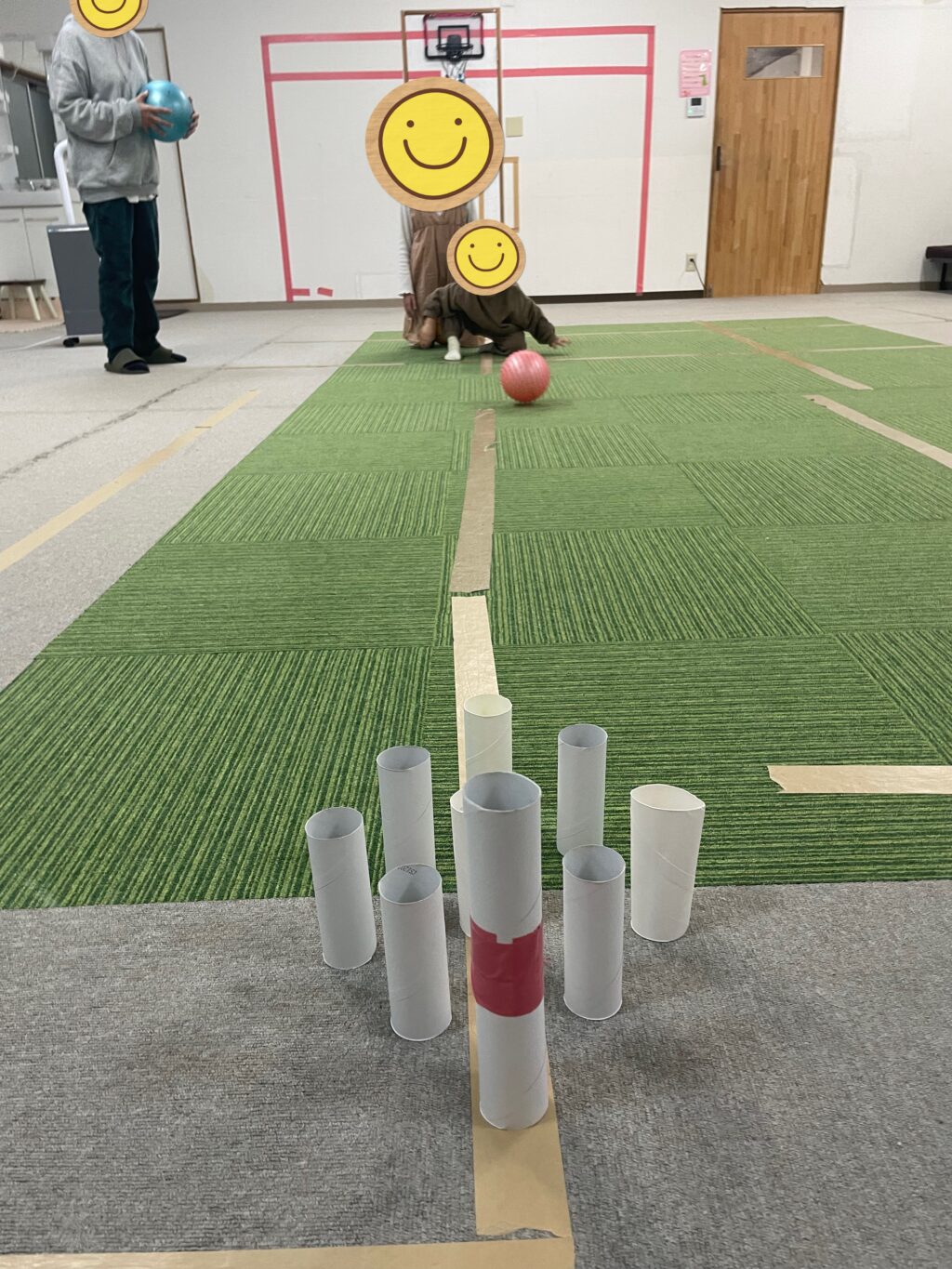 「段々と大きくしていくのは⁇」と提案するお友だちに「じゃぁ、大きいのは僕がやる❗️」と自分の身体より大きなバランスボールを頑張って転がす小さなお友だちの姿にほっこりするスタッフでした🎳