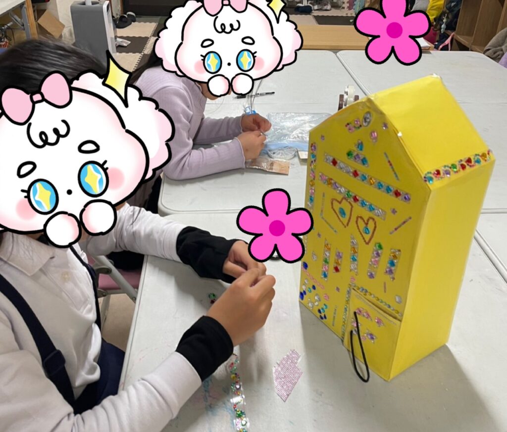 本日のマスコットハウス作りは昨日のお友だちと小さなお友だち2人🏠昨日の康二ハウスは外壁をスタッフが少し修正しお友だちがキラキラストーンを飾りつけていました。その横では