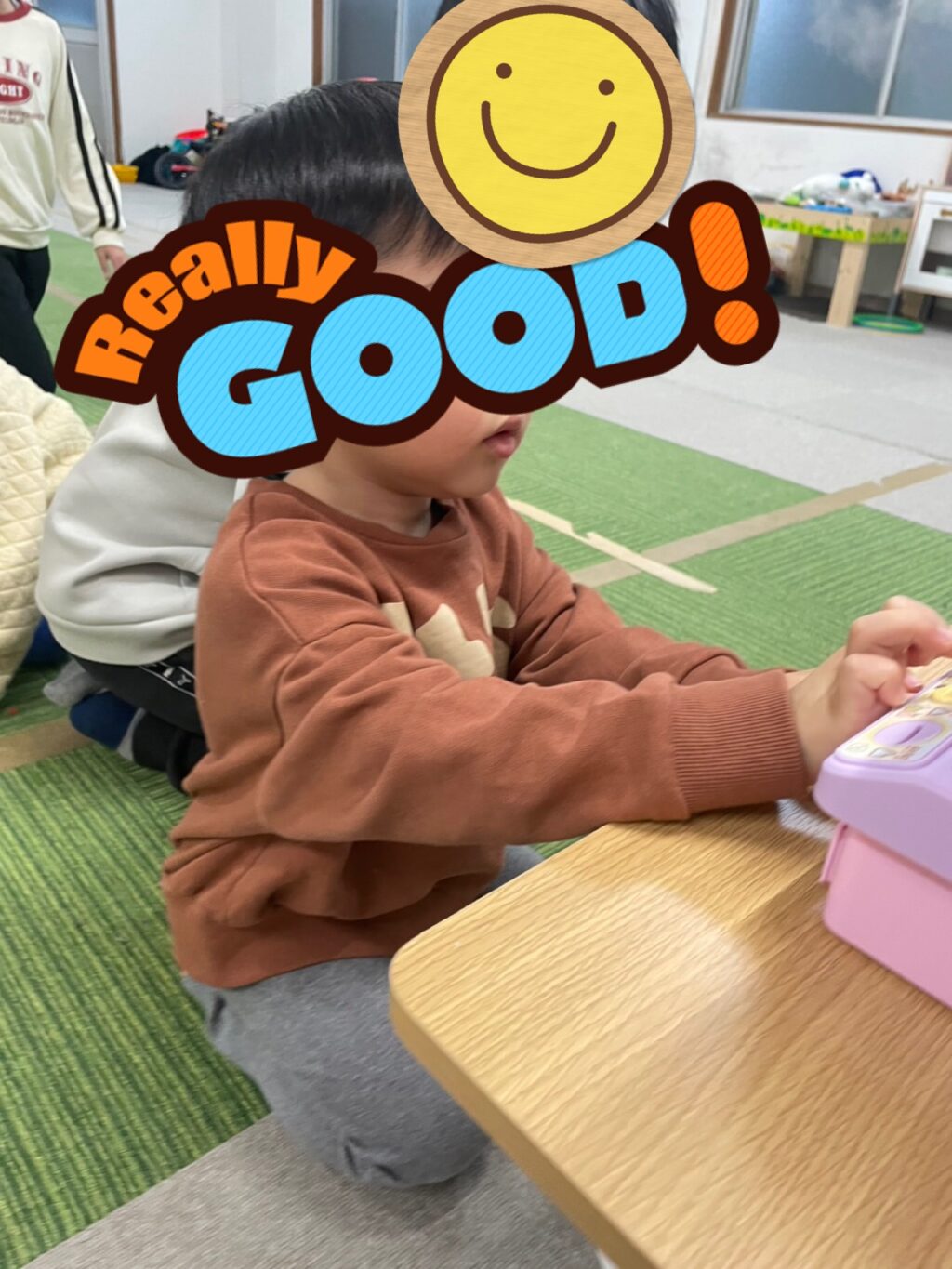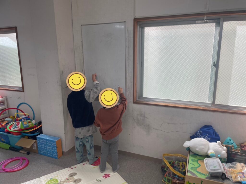いろえんぴつ😊小さなお友だちのお二人さんはホワイトボードにお絵描き✏️「タコ🐙」「僕はウーパールーパー描いてん😃」とスタッフに説明してくれていました☺️