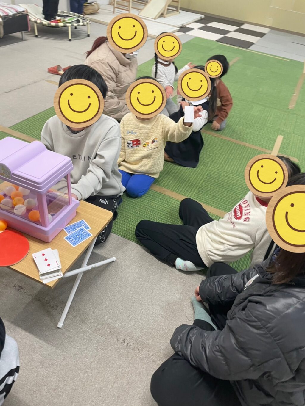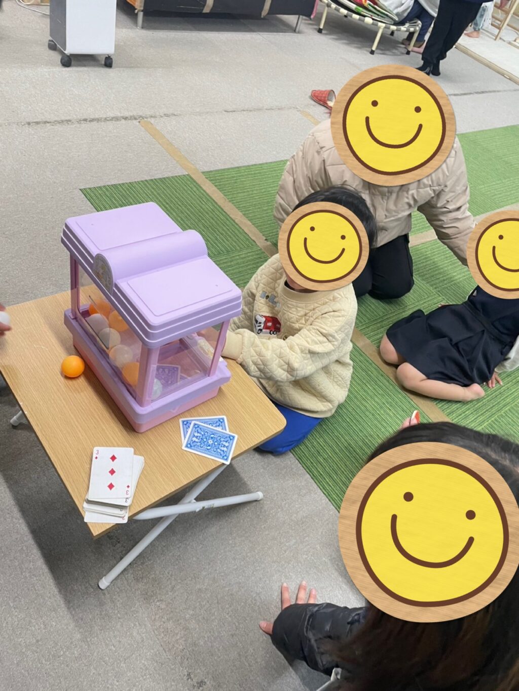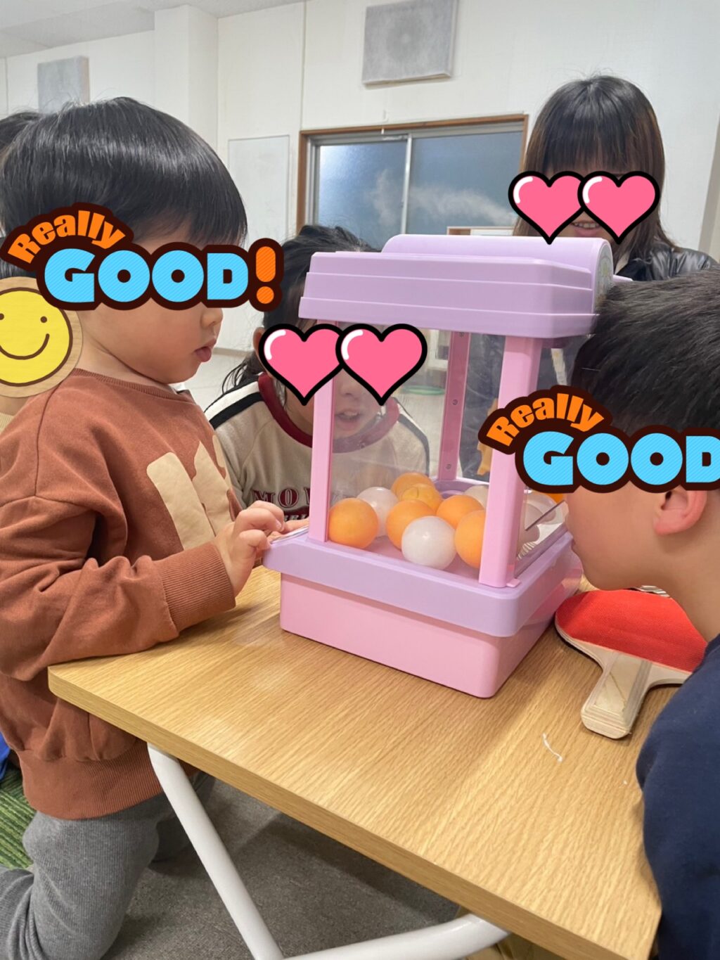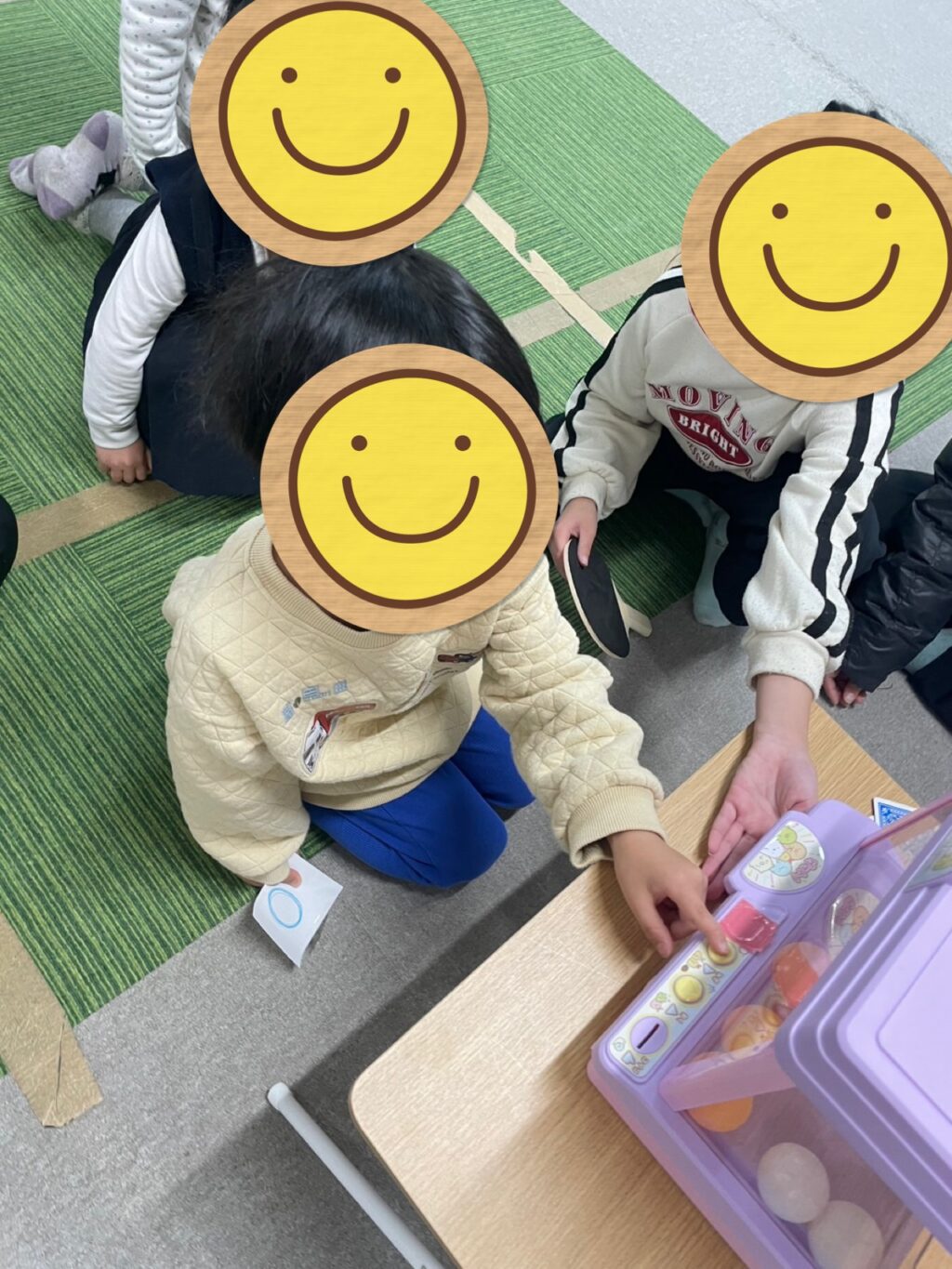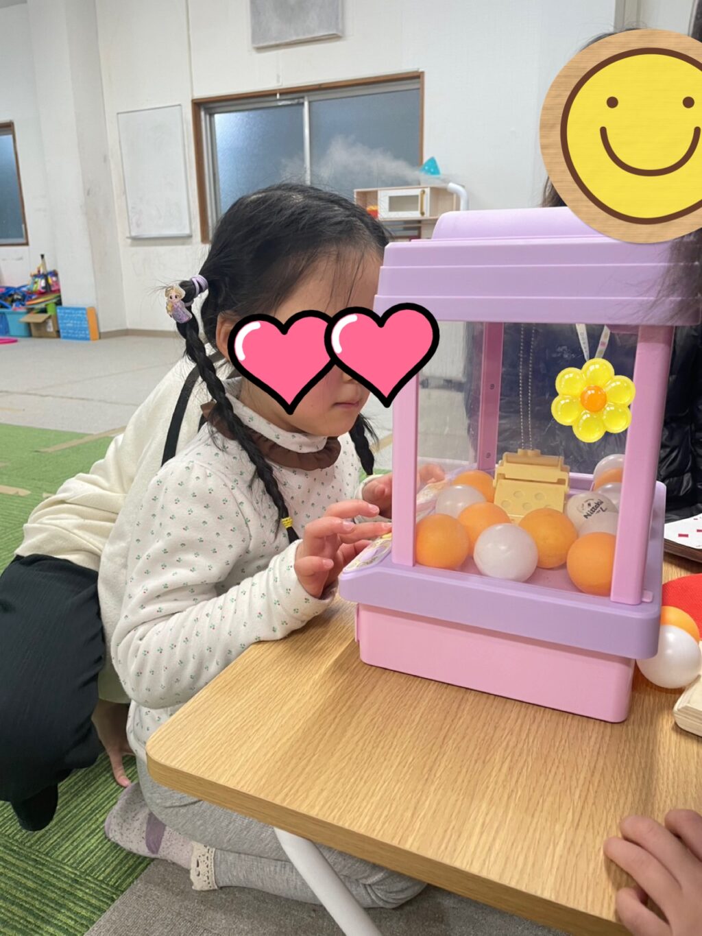 「イベントするからお片付けして1列に並んでくださ〜い😃」とスタッフが言うとみんなで協力してお片付け👍みんなで並んでスタッフからゲームの説明があり、静かに聞く事も出来ていました👌スタッフの持っている2枚の紙のどちらかを選んで書かれているボールの色をクレーンでゲット🏗️1番最初はお兄さんがお手本を見せてくれ見事ボールをゲットして小さなお友だち達は「〇〇君すごっ‼️😆」と言われ大照れ☺️後に続くお友だち達もクレーンゲームに夢中😆何度も何度も並び直してボールをゲット🏗️その度に「〇〇君上手👏」「〇〇ちゃんうますぎる😍」「〇〇君それで何個目⁉️スゴすぎる😃」と1人1人に声をかけて嬉しそうに笑うお友だち達の笑顔を見てニヤニヤしてしまうスタッフでした😁😁