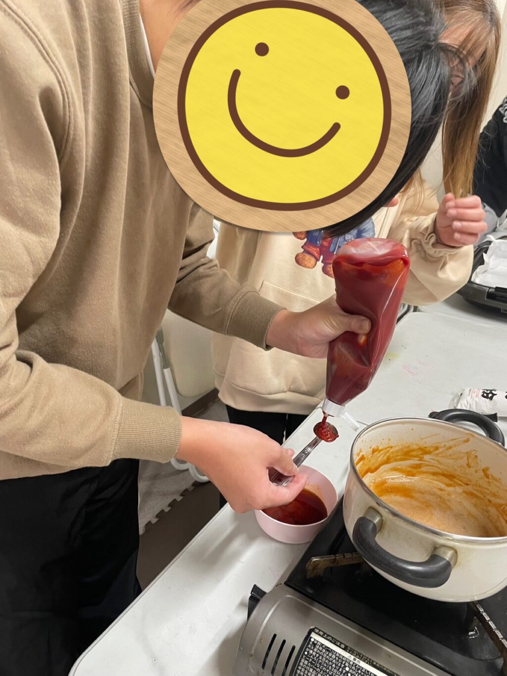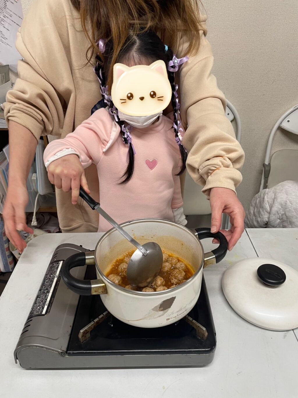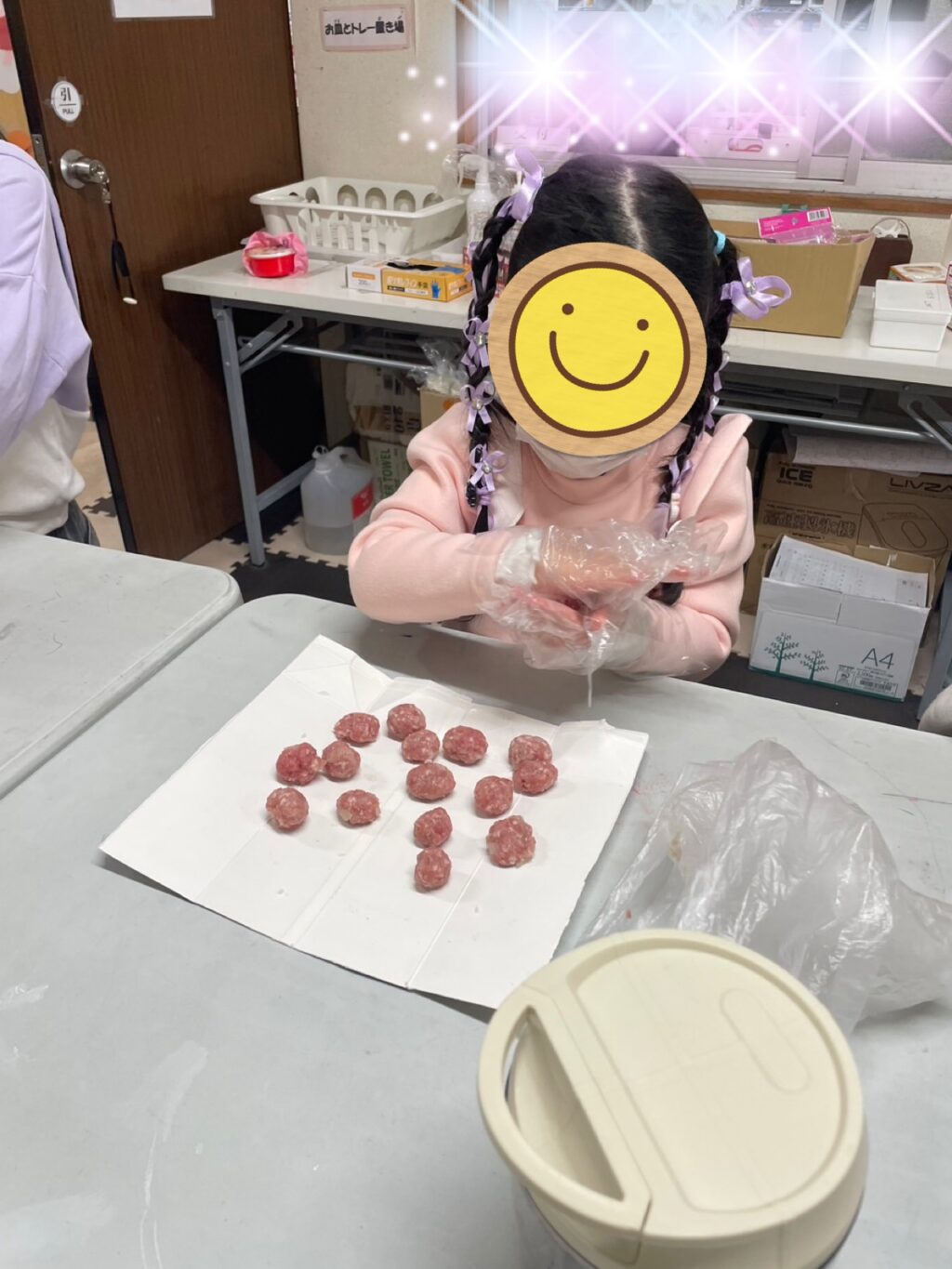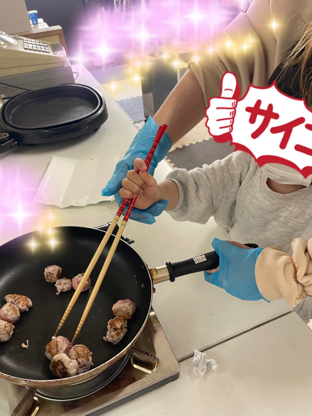 小さなお友だち達はブンブンチョッパーを使って上手にブンブン🌪️していました😊ミンチに玉ねぎを入れて好きな大きさにまるめていると「僕、大きなミートボールを食べるのが夢やってん。だから大きいのにする😁」と言って大きな肉玉を作るお兄ちゃん😁その真逆で小さくて可愛い肉玉を作る小さなお友だち😍💕丸めたお肉を少し焼いてから、あの美味しいタレも自分で計量し作ってもらいます😊1人1人スプーンを使って計量しお肉を煮詰めて出来上がり😃