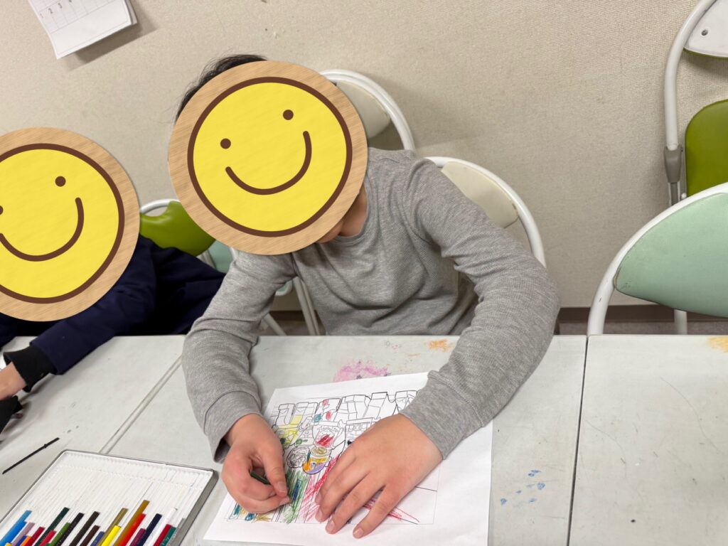 「マジで僕、塗るで😃」「私も本気やで😄」「見て見て、この色どうよ?」と、みんな真剣そのもの😁😁はみ出さないよう丁寧に塗るお友だち、あえて大胆な色使いで攻めるお友だち、グラデーションに挑戦するお友だち…。