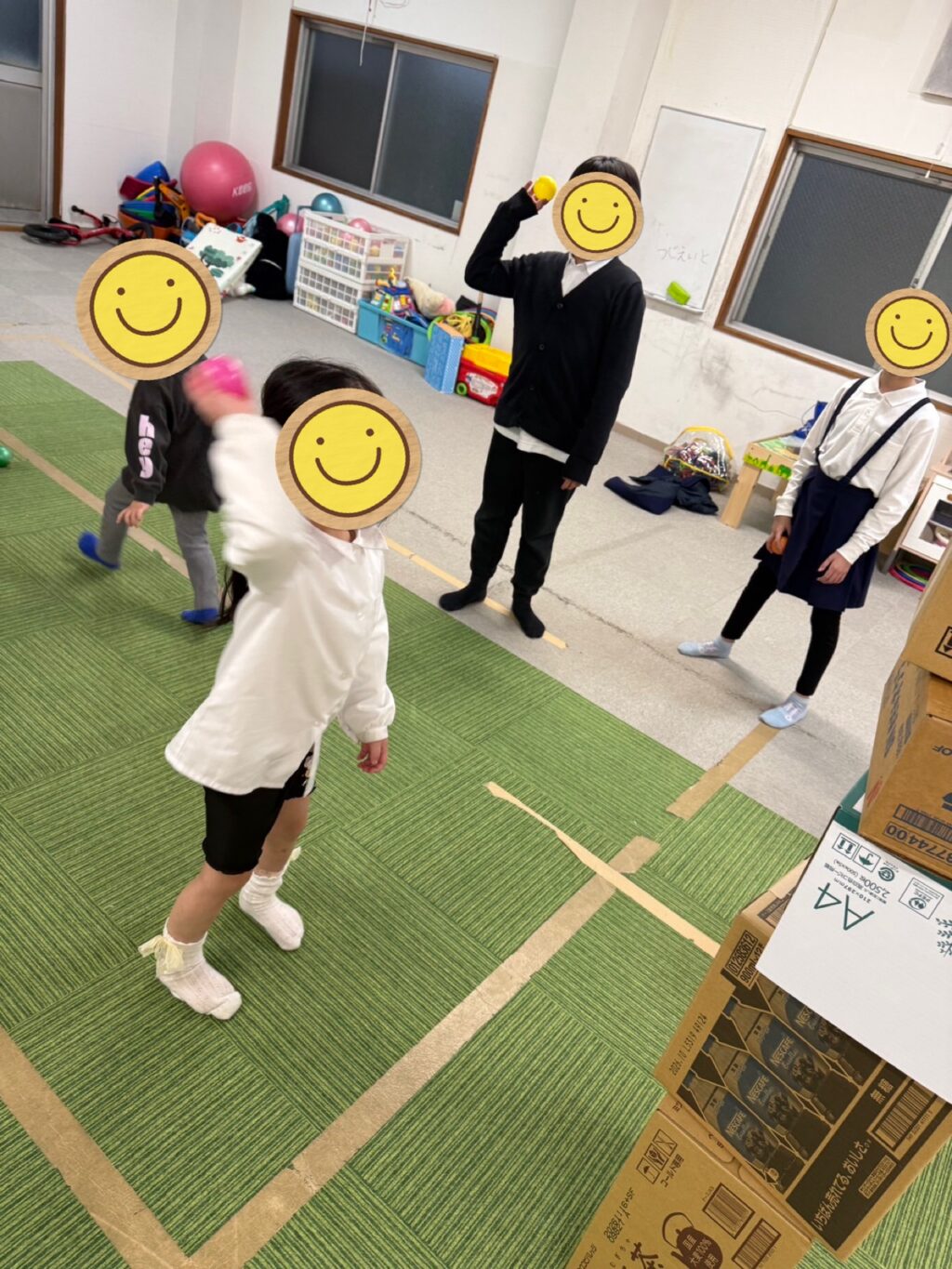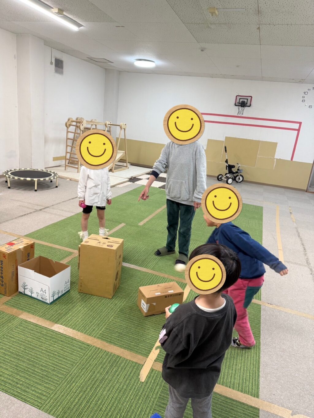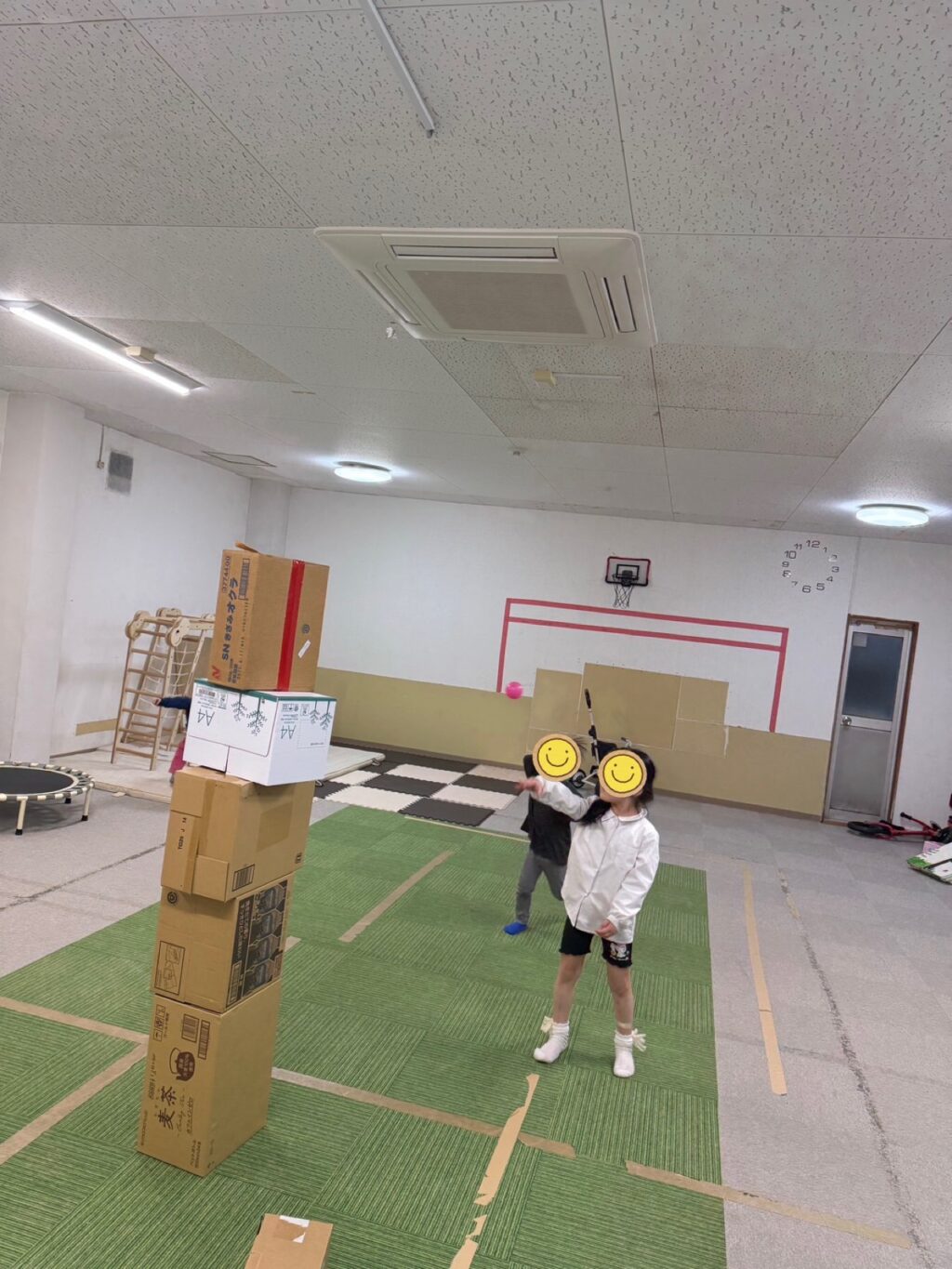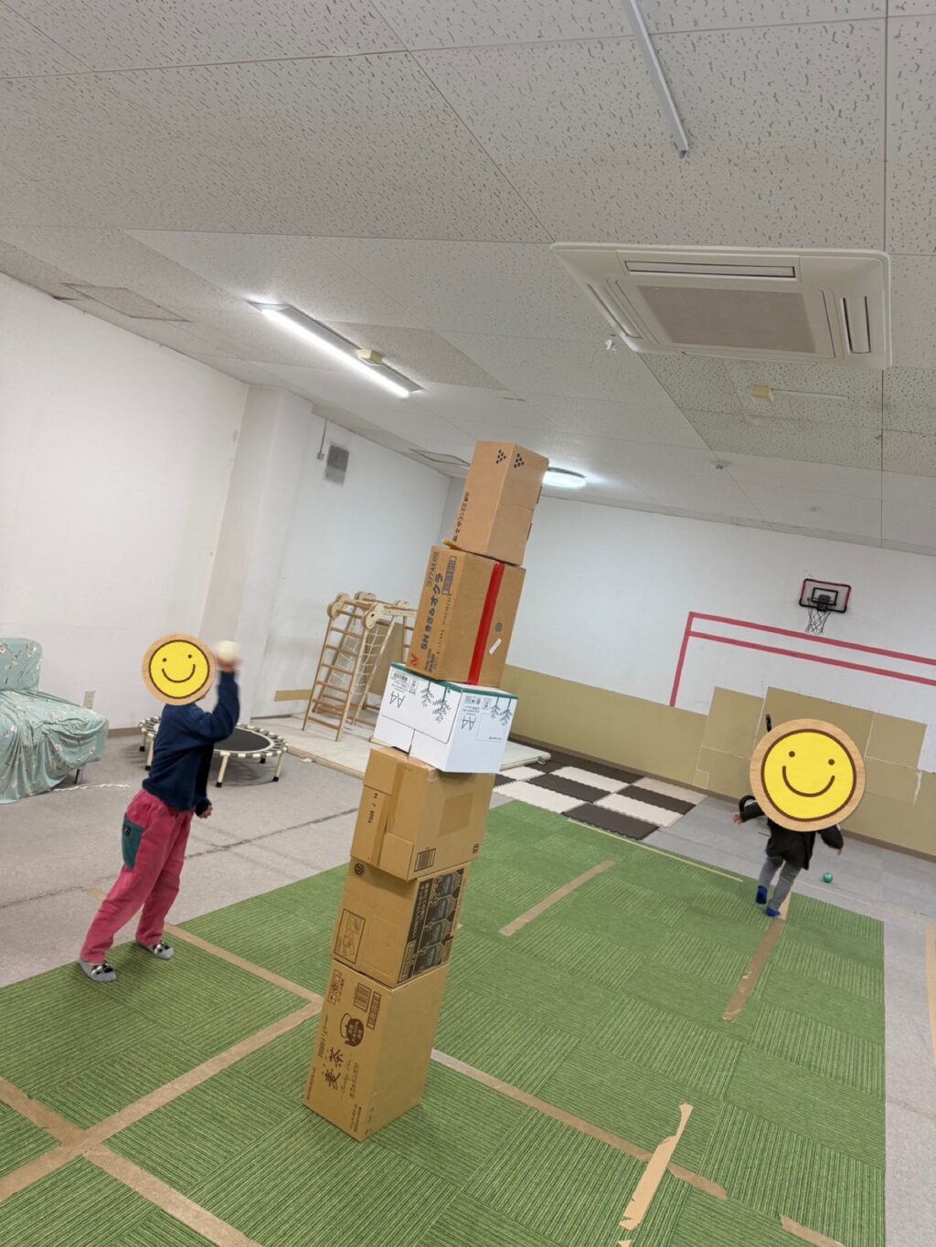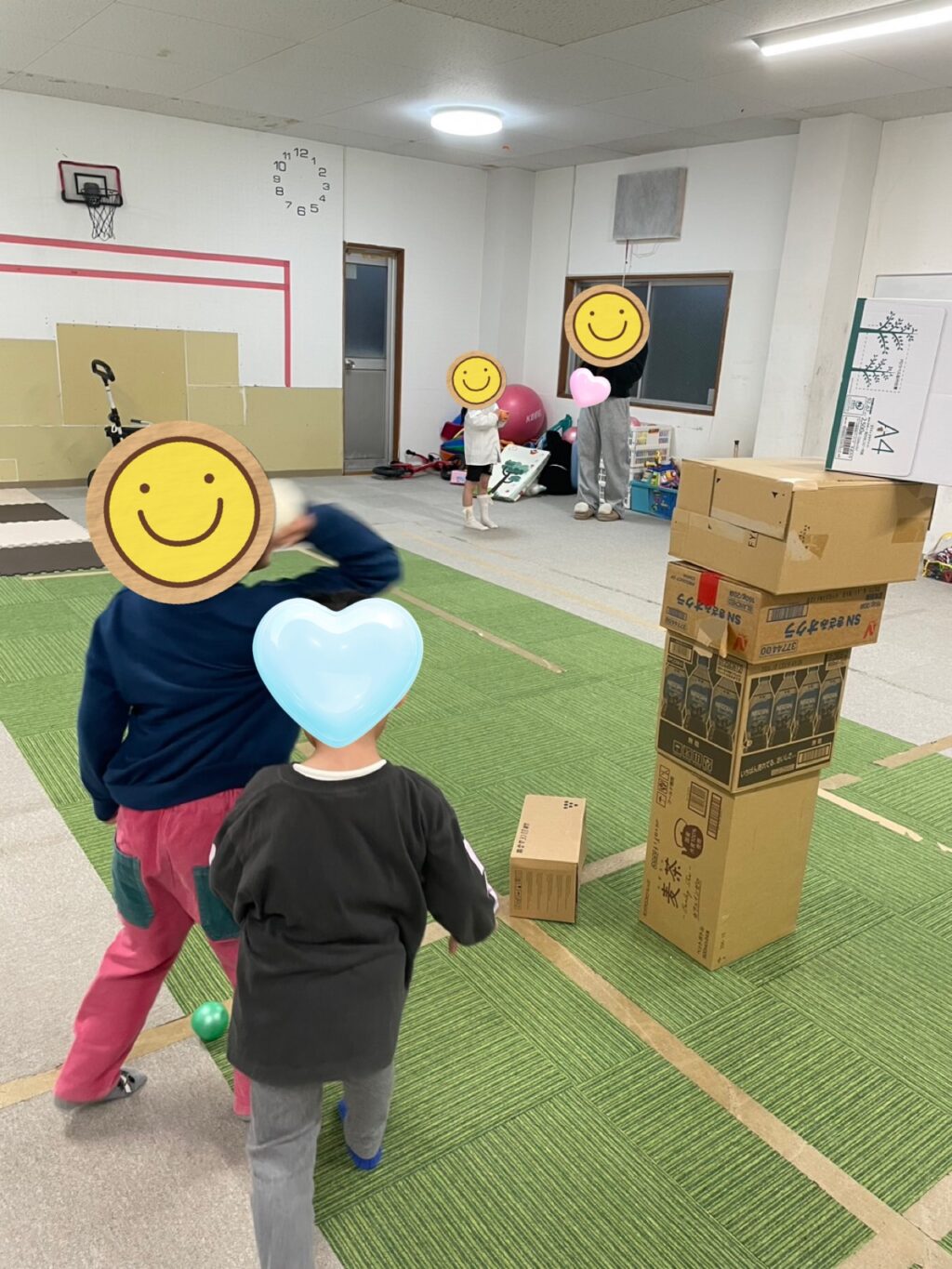 ダンボールをスタッフが積み上げていく時点でワクワクするお友だち達😆「みんな〜ボール持った?」