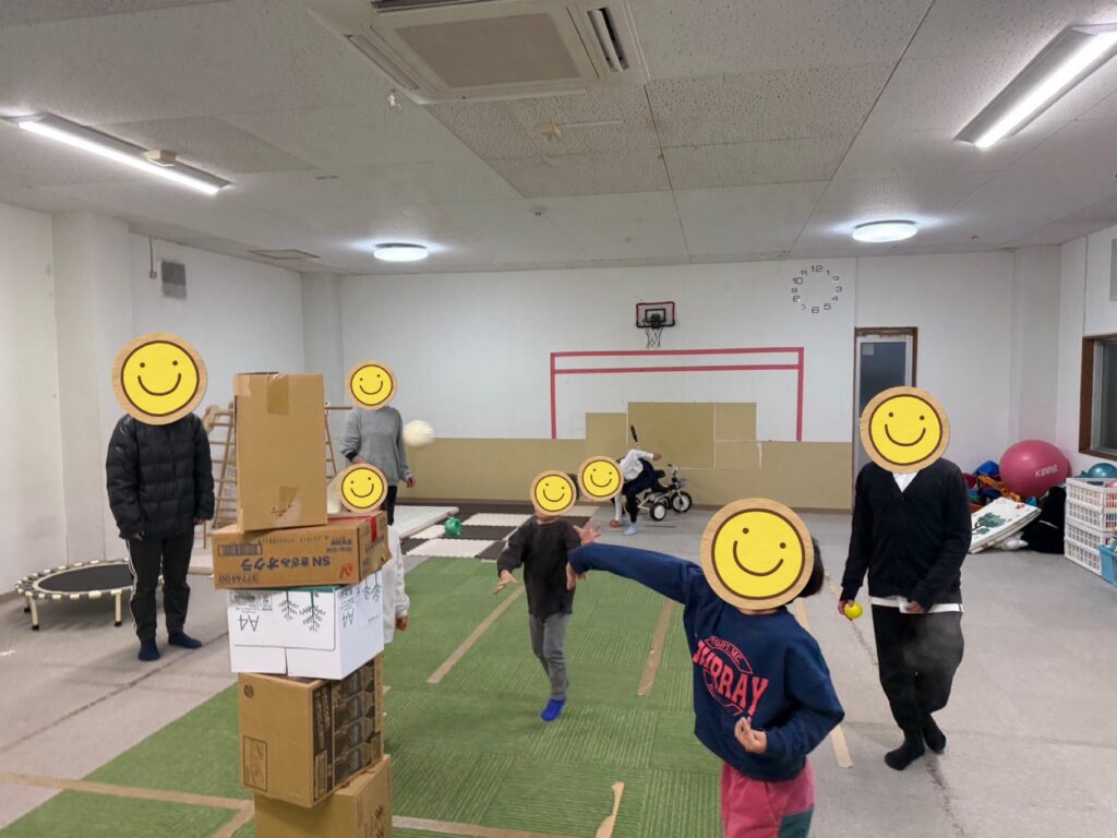 「では、では、よ〜い、スタート❗️」のかけ声でみんなボールを投げてダンボールに当てて倒していくのですが、段々と下になるにつれてなかなか倒れなくなるも、みんなで力合わせて頑張って何度も何度もダンボールにボールを当てて…倒れた瞬間…