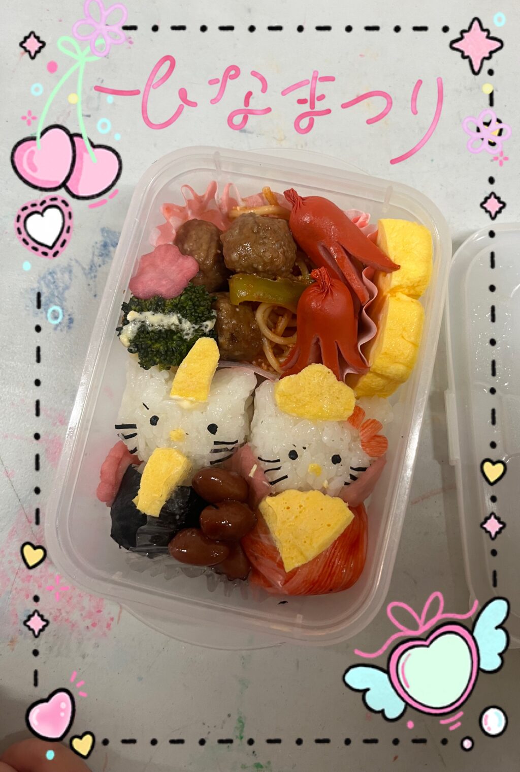 今日は可愛い「ひな祭りお弁当」のお友だち😊お友だちやスタッフから「可愛い🩷」「〇〇ちゃんいいな〜☺️私もこんな可愛いお弁当作ってもらいたいわ🍱」と言うお友だちもいました☺️☺️