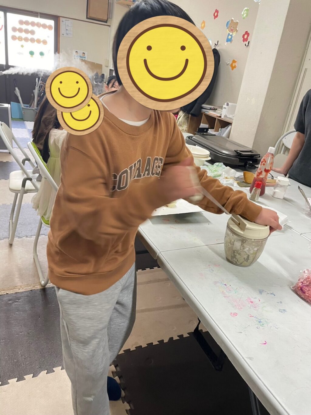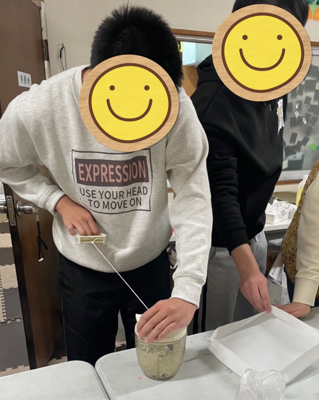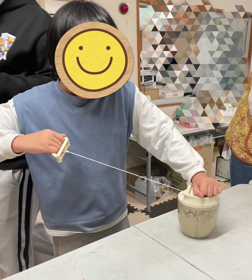 と言う声でカットした玉ねぎをブンブンチョッパーに入れみんな、気合いを入れてブンブンスタート❗️いつもは玉ねぎに泣かされているお友だち達も