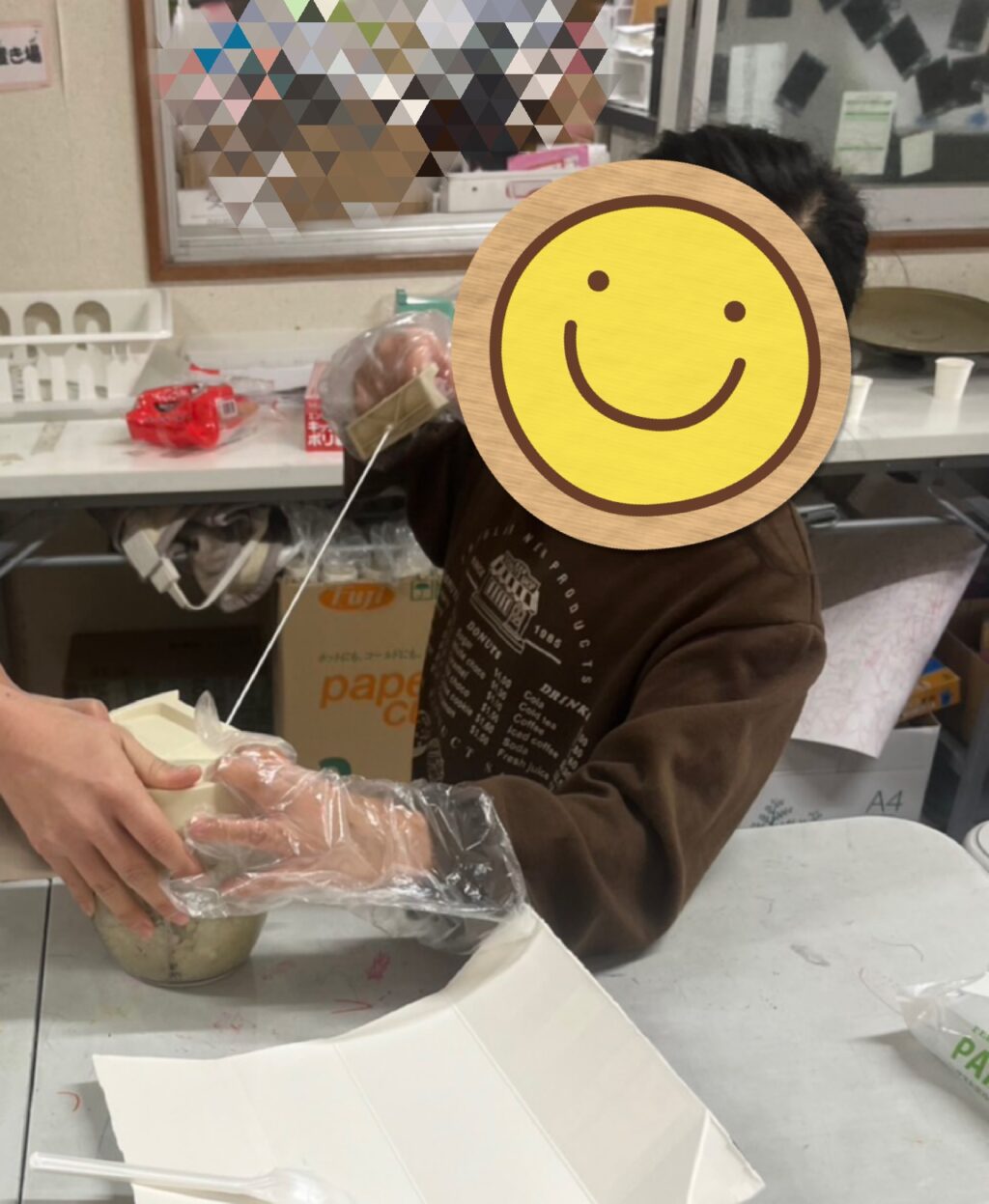 手洗い、マスク、消毒をしてテーブルにスタンバイするお友だち達に玉ねぎのみじん切りを「包丁でみじん切りする人⁉️