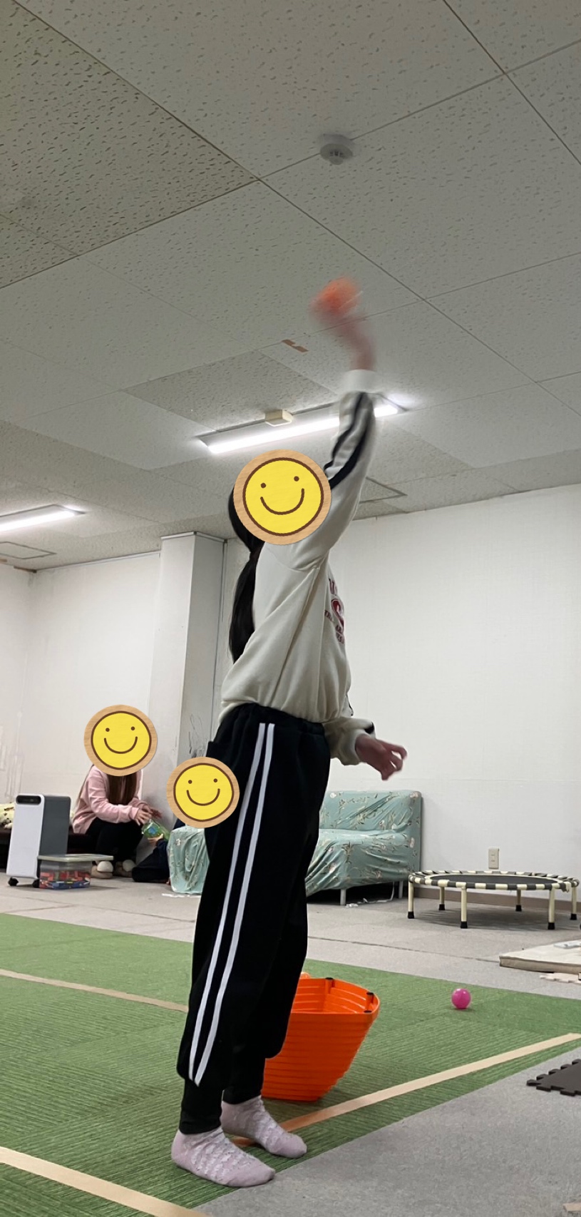 カゴの手前に落ちたり、遠くまで飛んでしまったりと、思ったより難しい玉入れにみんな大盛り上がり‼️🤣