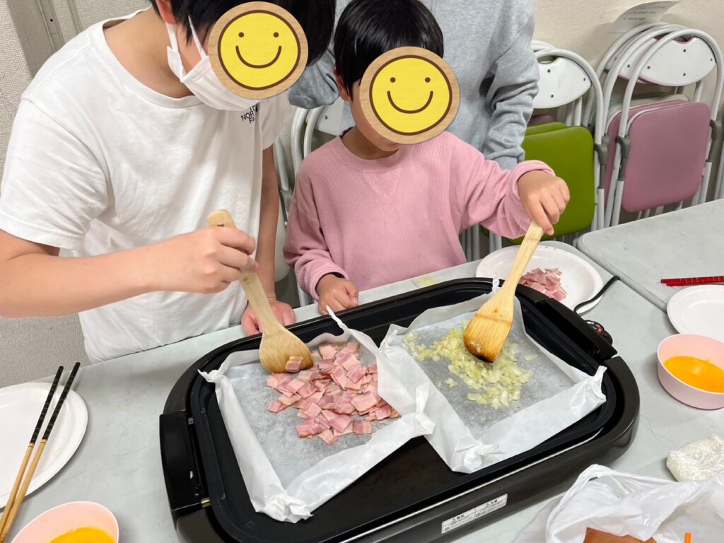 カットした具材を炒めてご飯を投入「うわぁいい匂い😋」と言うスタッフに「私の少しならあげるよ😄」と言ってくれた優しい小さなお友だち☺️「ありがとう☺️〇〇ちゃんが頑張って作ったご飯は絶対に美味しいから残るかな〜⁇」と言いながらニコニコでご飯を炒めていました😁